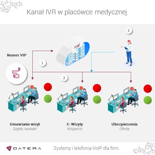Kanał IVR to infolinia, gdzie pacjent wiele rzeczy może załatwić automatycznie po prostu dzwoniąc i wybierając odpowiednie opcje z klawiaturą numeryczną telefonu. Interaktywne menu IVR jest jedną z najpopularniejszych funkcji wirtualnych central i jest istotnym elementem odciążania pracowników obsługi klienta (gdyż pozwala sortować połączenia przychodzące i przydzielać je odpowiednim zespołom) – to może zrobić znacznie więcej, m. in. pozwolić na komunikację z zewnętrznym webservice. To już droga do pełnej automatyki, na wzór np. infolinii bankowych.